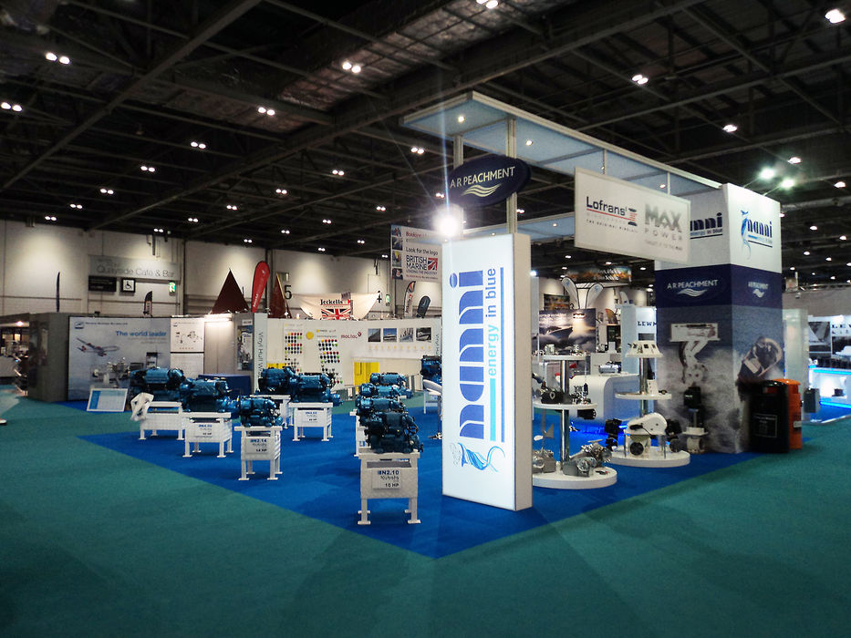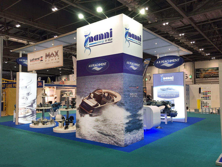 An impressive open-plan modular exhibition stand for A R Peachment at London Boat Show showcasing their marine engines & expertise.